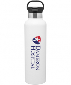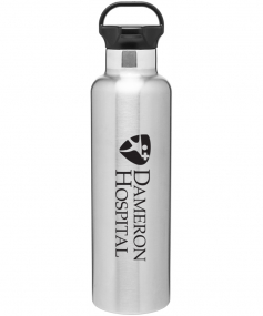 24 oz powder coated double wall 18/8 stainless steel thermal bottle with copper vacuum insulation, threaded gear-shaped insulated lid and carrying handle Complies with FDA, Prop 65. 11.25" H x 3" W