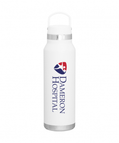 25 oz double wall 18/8 stainless steel thermal bottle with copper vacuum insulation, threaded insulated lid with carrying handle, high polish accent, stainless steel base, and powder coated finish. Hand wash recommended; Do not microwave. Dimensions: 10 H x 3".