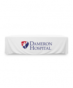8 ft. Premium PolyKnit throw table cover with one color logo. Fits a 96 inch wide x 30 inch deep table. All corners are rounded meaning they will not gather and lay on the floor. Floor length on 4 sides. This cloth requires no ironing, is EasyCare machine washable and dryer safe.