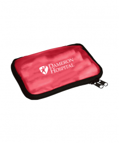 Vinyl case with zipper includes a 12 hour safety light stick, 10 latex-free bandages, 5 snip bandages, two 2" x 3" adhesive pads, 2 knuckle bandages, 5 antiseptic towelettes, 5 first aid cream packets, 2 non-adhesive pads, 1 gauze roll, 1 roll of adhesive tape, and 1 first aid guide.